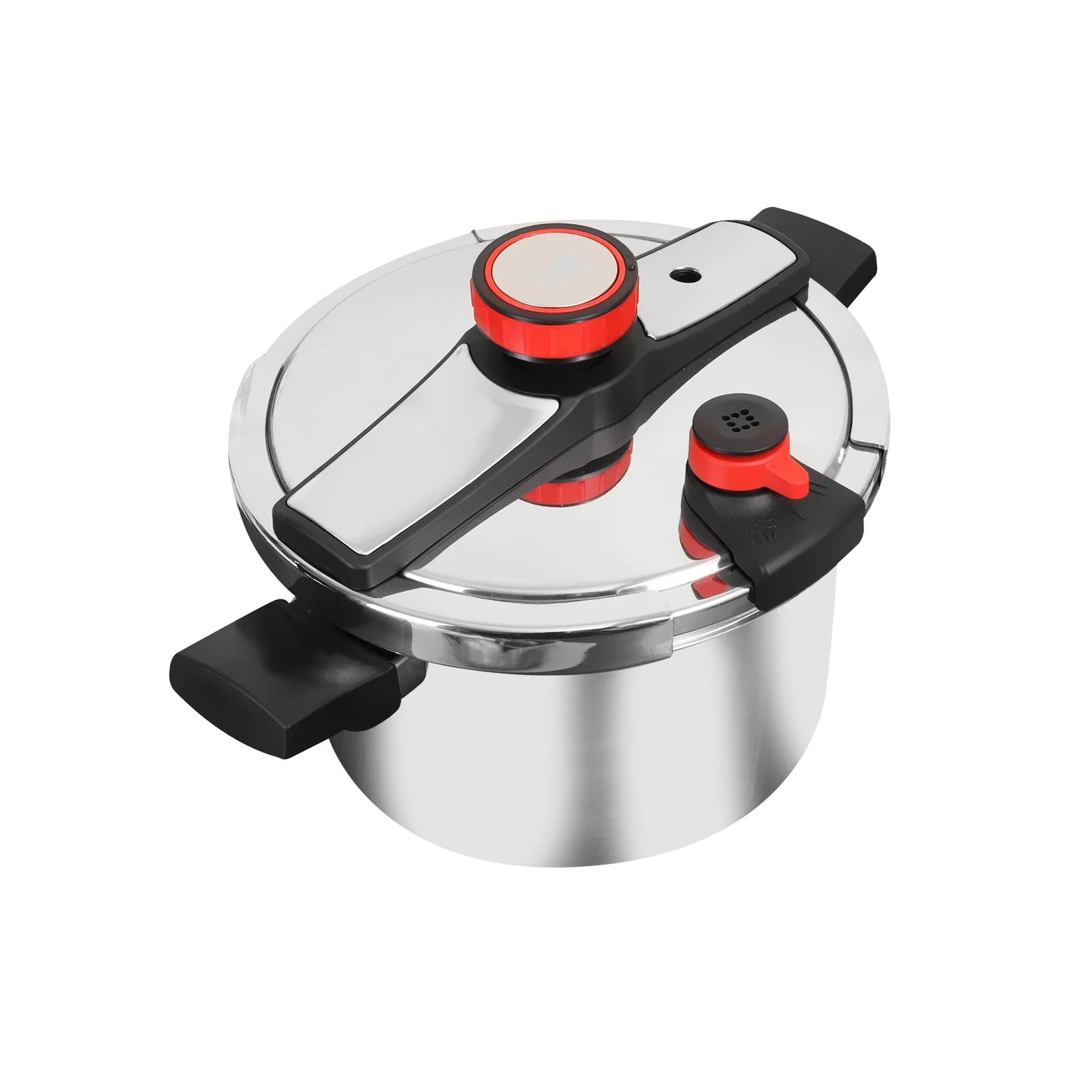 【Protection Device】: Compared to conventional cooking, this pressure cooker design with has 4 secure locking machanism knob depressurize knobs, locking knob, Anti heat handle and Sealing cap that ensures risk free.