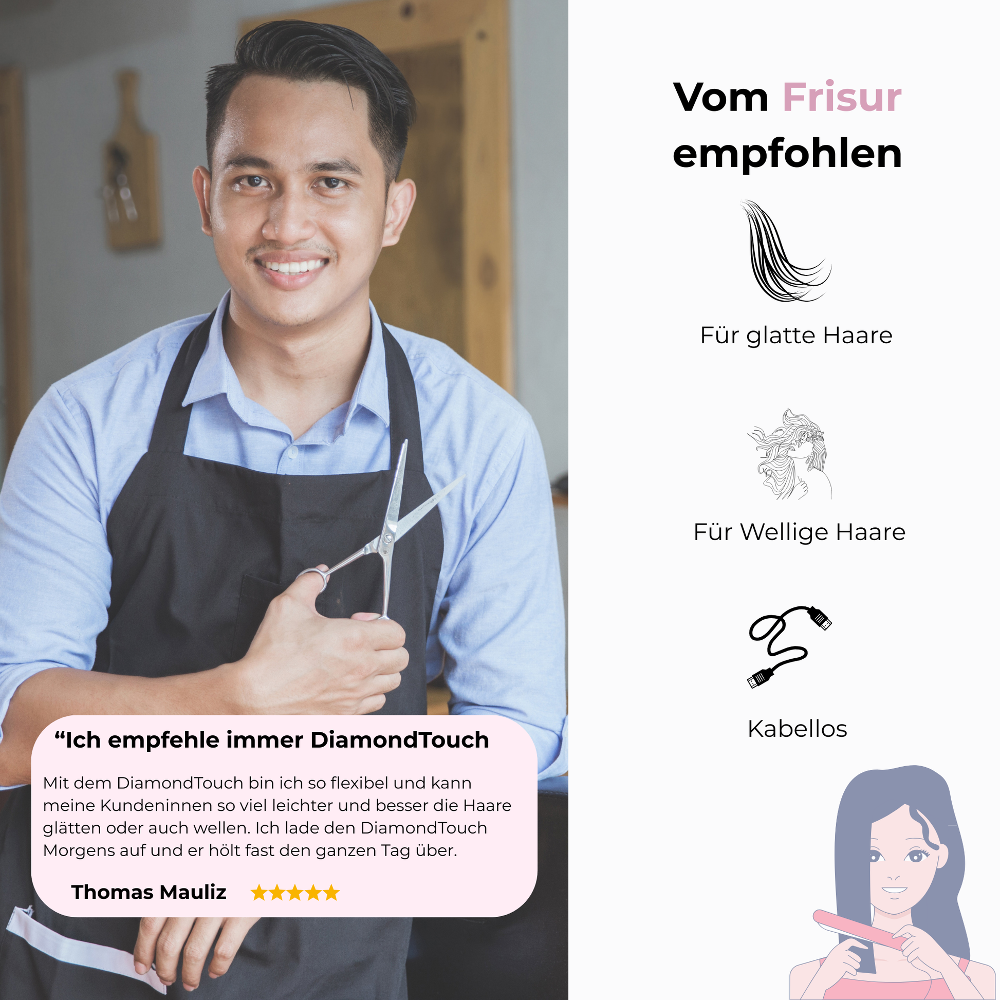 Kabellos, kompakt und sofort einsatzbereit – mit dem DiamondTouch Mini stylst du dein Haar überall und jederzeit. Kein Kabel, kein Stress, nur perfekt glattes, glänzendes Haar, egal wo du bist! ✨