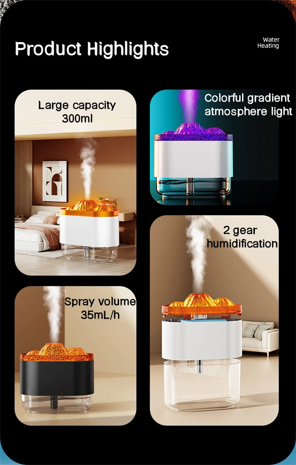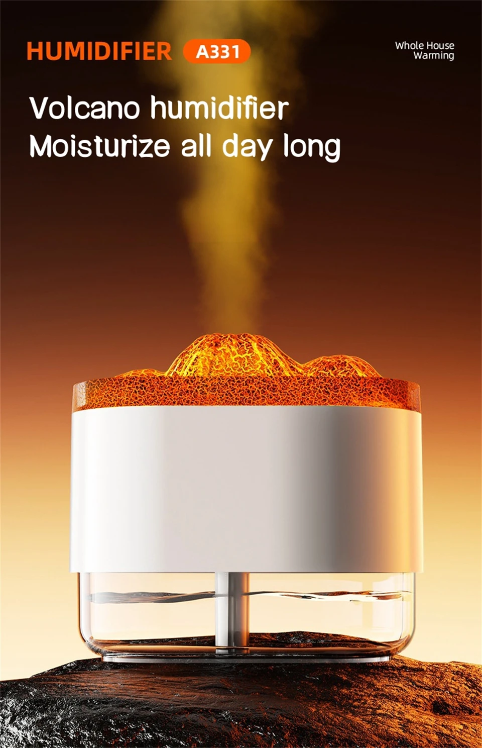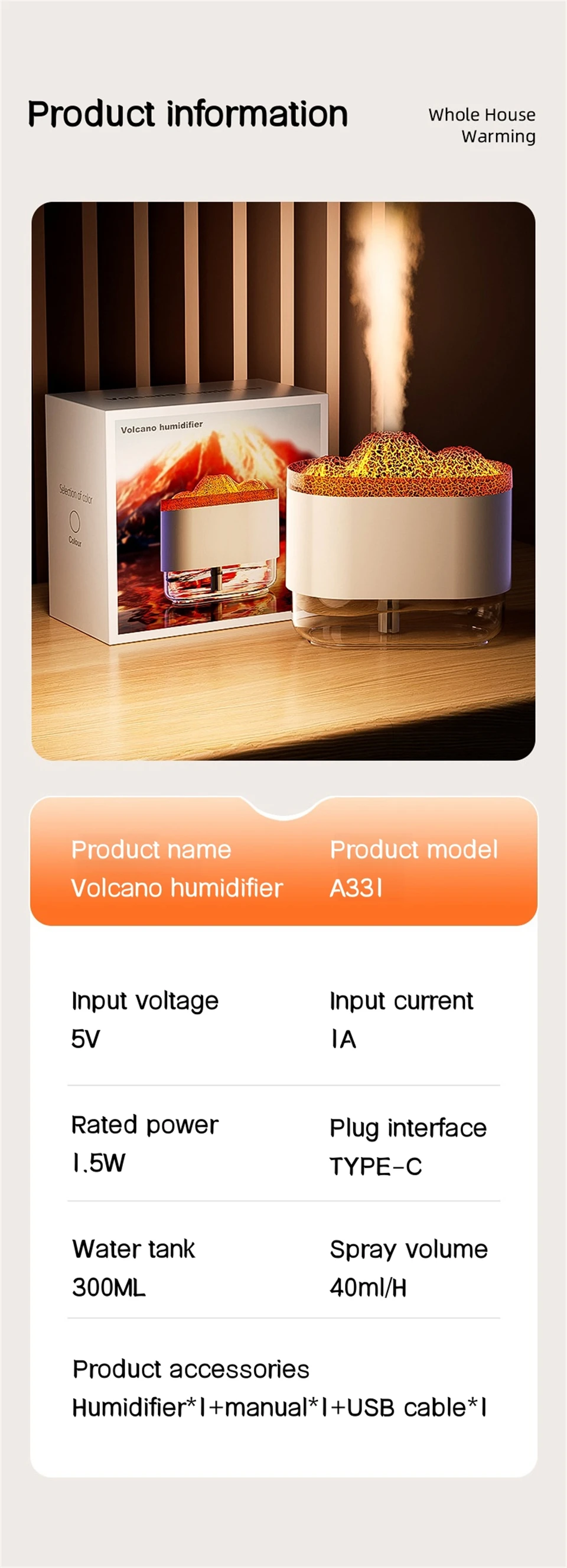 USB Volcano Air Humidifier Aromatherapy Diffuser with Ambient Light 300ML Ultrasonic Mist Maker Quiet Sprayer for Bedroom Office